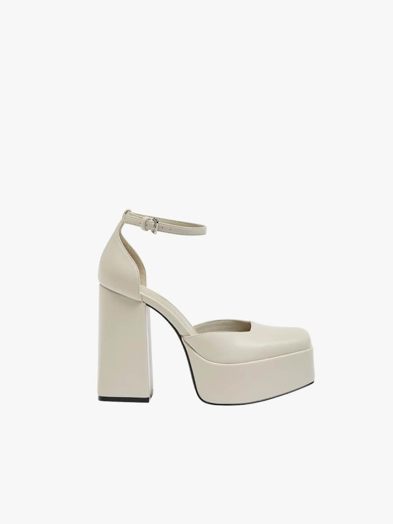 High-heel block heel platform shoes. Available in a range of colours. Buckled ankle strap fastening.