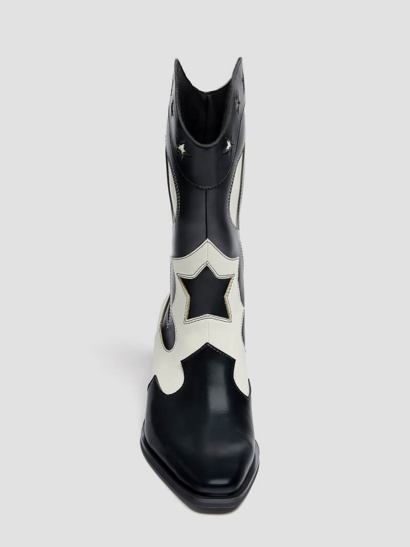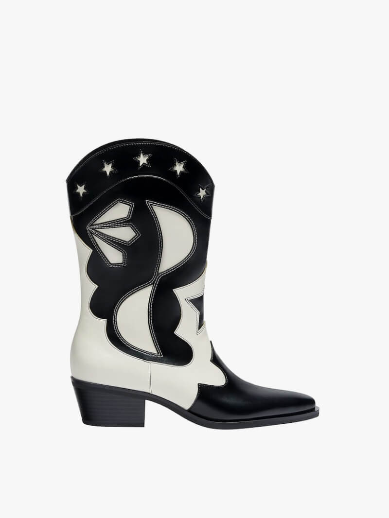 Cowboy-style boots available in several colours. Contrast-coloured piece detail on the upper. Pointed toe. Heel height: 5 cm.