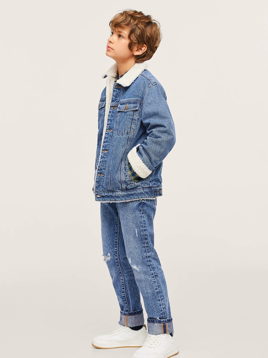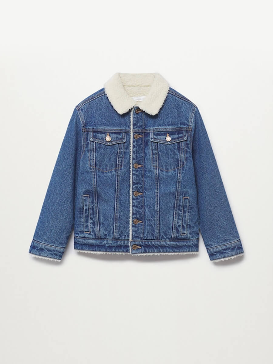 Blue denim jacket with matching fleece lapel collar. Front button closure. Front flap patch pockets at chest.
