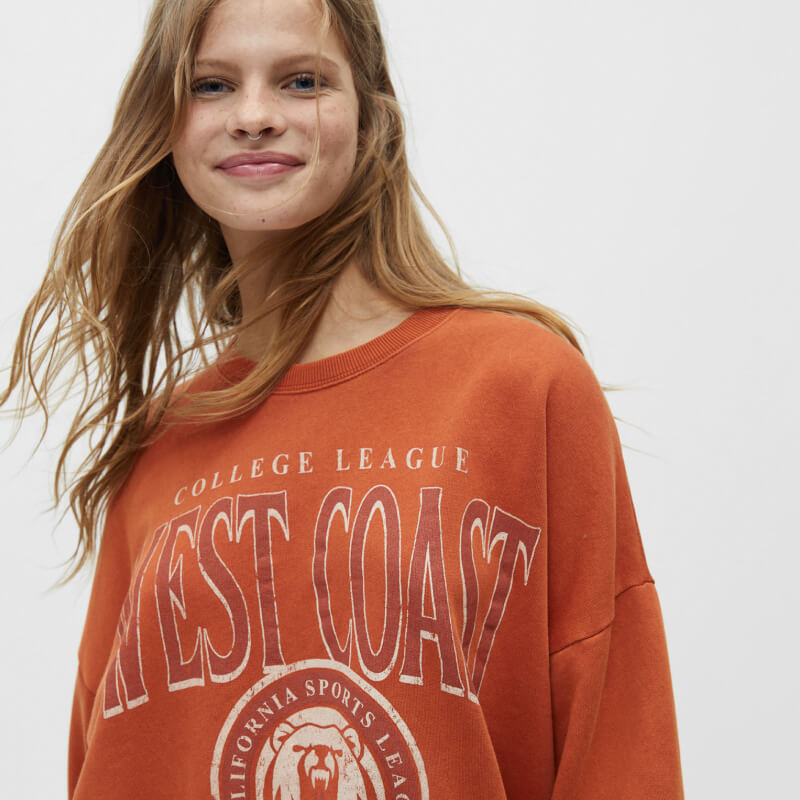 Long sleeve crew neck college sweatshirt with a print detail.