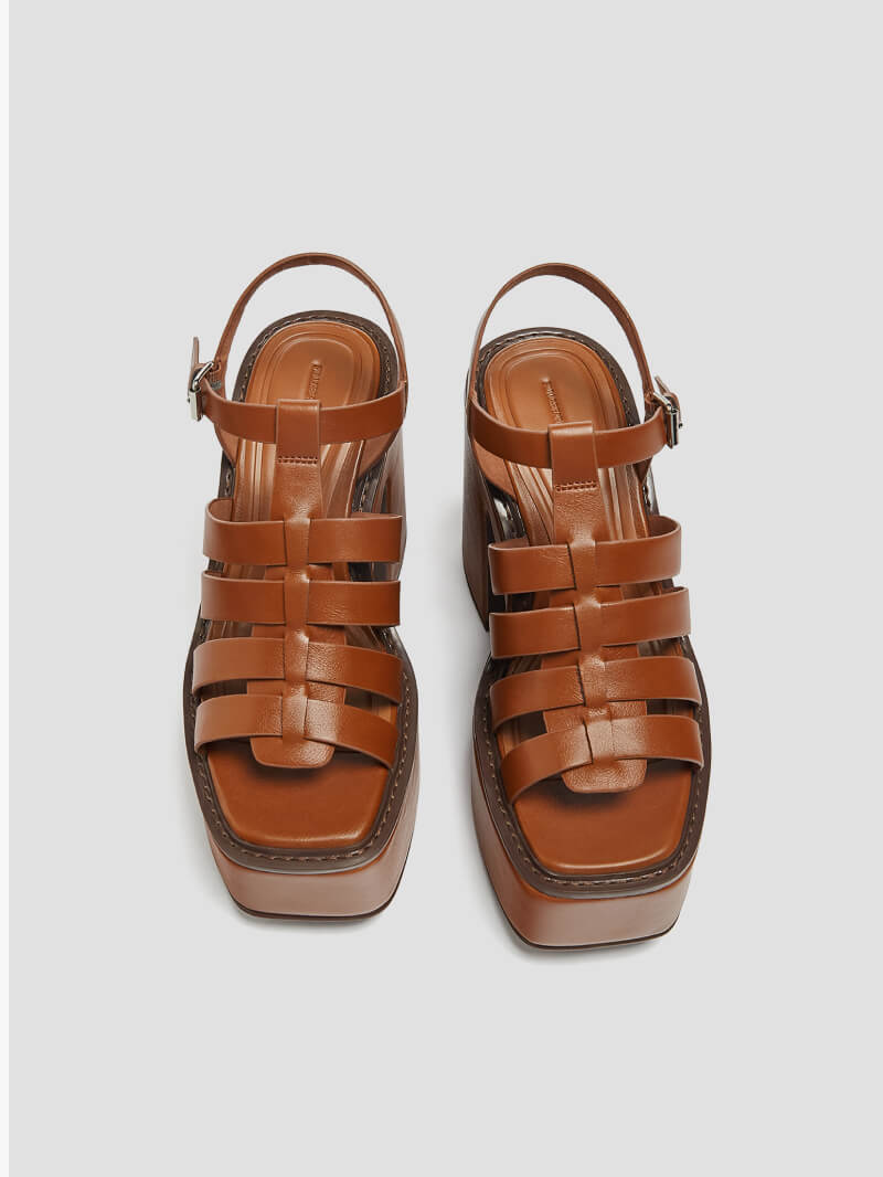 High-heel platform cage sandals. Straps on the upper and side buckle fastening. Block heel and platform. Heel height: 11 cm. Platform height: 4.5 cm. AIRFIT®. Flexible technical latex foam insole, designed to offer greater comfort.